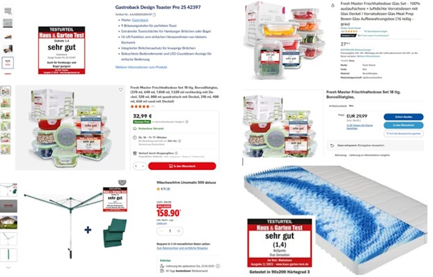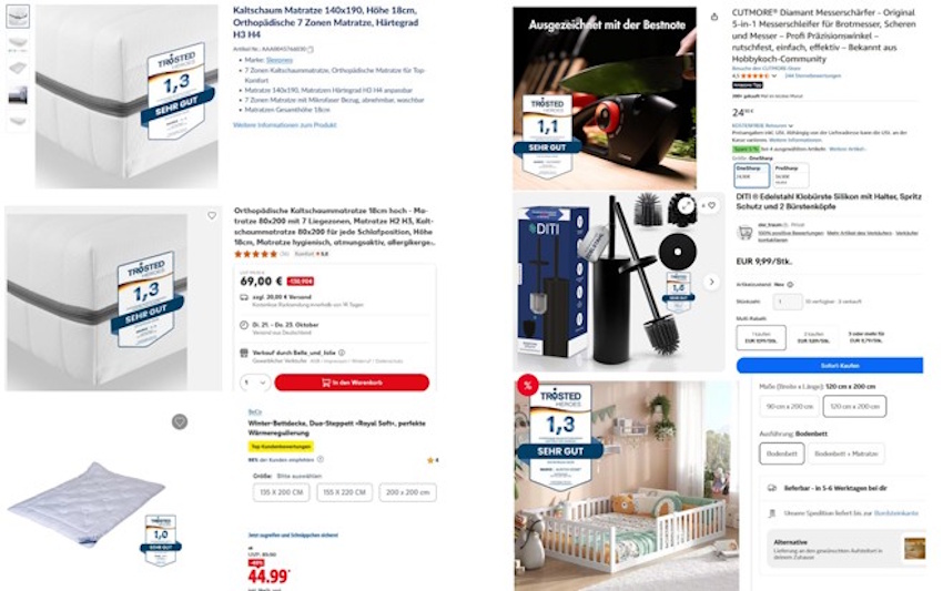 Auf allen sechs von uns durchsuchten Online-Marktplätzen (aktuell Metro, Kaufland und Lidl, zuvor Amazon, Ebay und Otto) finden sich Produkte mit dem Label Trusted Heroes. Eine Matratze bei Metro, eine andere bei Kaufland, eine Bettdecke bei Lidl, ein Messerschärfer bei Amazon, eine Klobürste bei Ebay und ein Kinderbett bei Otto. Unsere Einschätzung von Trusted Heroes lesen Sie hier: Trusted Heros.