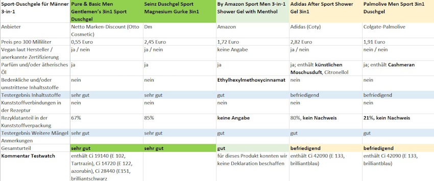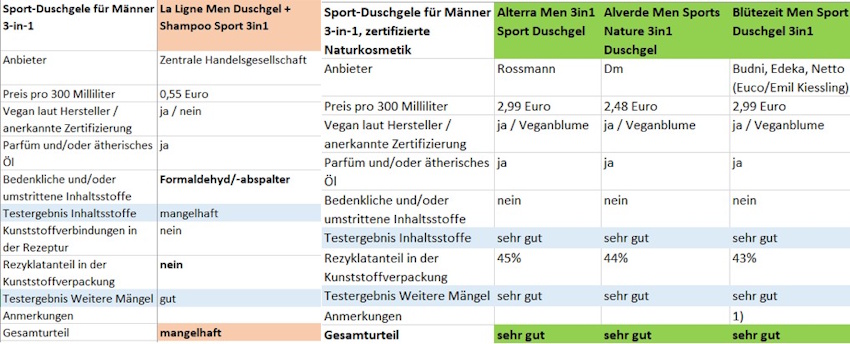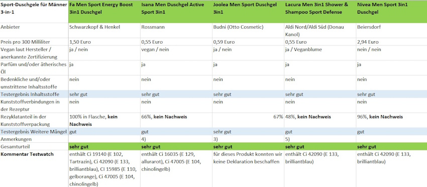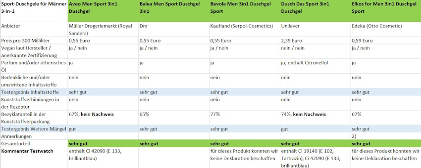 Zu Duschgelen heißt es: „Wir haben 19 Sport Duschgele für Männer mit 3-in-1-Auslobung getestet. Verschiedene Labore untersuchten die Duschgele auf Formaldehyd/-abspalter, Nitromoschus- und polyzyklische Moschusverbindungen sowie Cashmeran. Anhand der Deklaration erfassten wir synthetische Polymere und UV-Filter.“ Das Ergebnis: „Gute Nachrichten für Fans von 3-in-1-Duschgel: Von 19 getesteten Produkten können wir 16 empfehlen.“