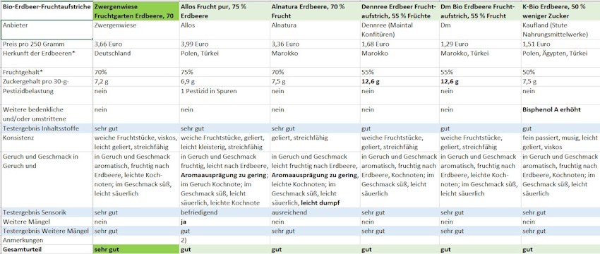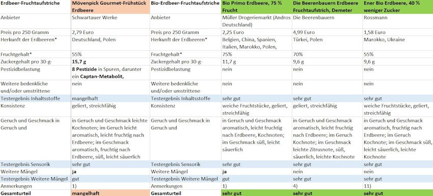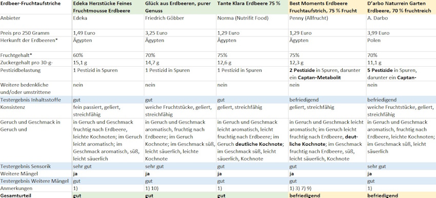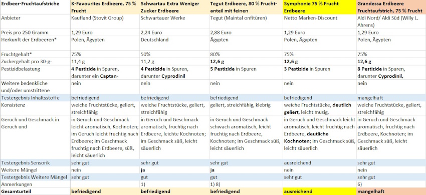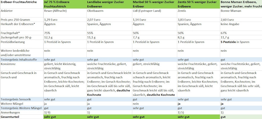 Unter der Überschrift „So haben wir getestet“ schreibt Öko-Test: „Wir haben 25 Erdbeer-Fruchtaufstriche in (Bio-)Supermärkten, Discountern und Drogeriemärkten eingekauft. In spezialisierten Laboren ließen wir alle Produkte auf Pestizid-Rückstände untersuchen. Geschulte Sensorik-Experten erfassten und bewerteten zudem Aussehen, Konsistenz, Geruch und Geschmack der Fruchtaufstriche. Die Hersteller fragten wir nach der Herkunft der verwendeten Erdbeeren.“ Das Ergebnis: „Mehr als die Hälfte der Erdbeer-Fruchtaufstriche im Test können wir empfehlen. Einige enttäuschen allerdings mit bis zu acht Pestizidrückständen und unserer Ansicht nach zu viel Zucker.“