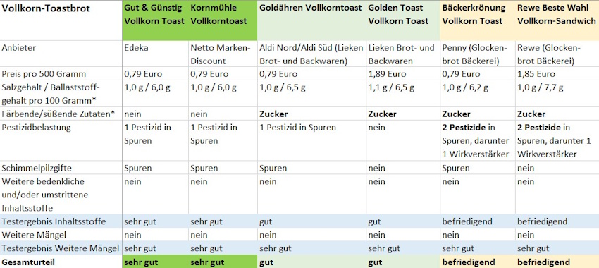 Zumindest für einige Regionen stimmt das Gesamturteil für den Gut & Günstig Vollkorn Toast von Edeka nicht. Er enthält laut Öko-Test keine süßende Zutat. In der Zutatenliste auf edeka.de ist jedoch Invertzuckersirup aufgeführt. Auf Nachfrage schreibt uns Edeka: „Unsere Eigenmarkenartikel werden teilweise je nach Region von unterschiedlichen Herstellern zugeliefert. Die Rezepturen können sich dabei je nach Hersteller leicht voneinander unterscheiden. Dies betrifft in diesem Fall auch das Gut & Günstig Vollkorntoast.“ Mit dem Sirup ist das Gesamturteil nicht „sehr gut“, sondern „gut“. Daher: Wenn man sich schon auf die Deklaration verlässt und nicht testet, sollte man sicherstellen, dass sie korrekt ist. Zumindest ein Doppelcheck von Produkt und Internetseite sollte selbstverständlich sein.
