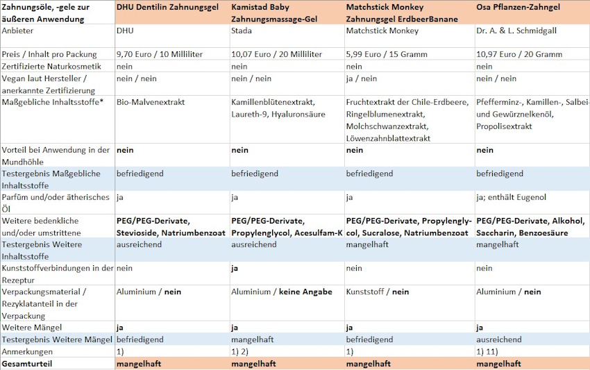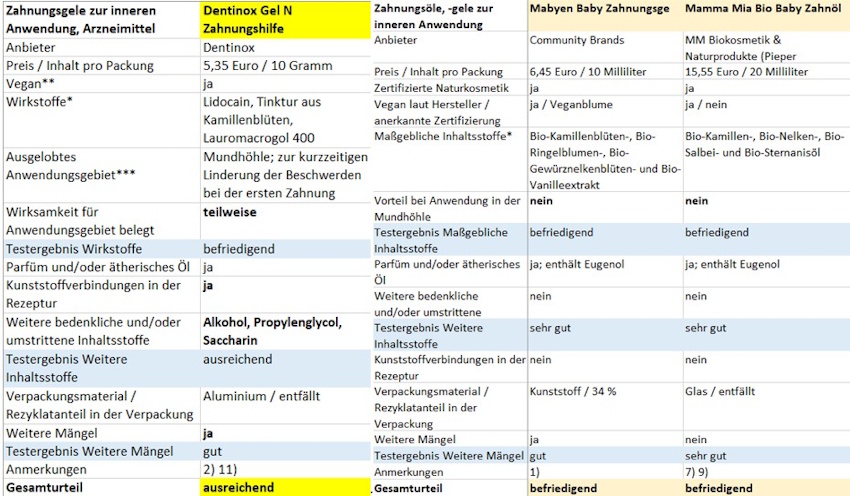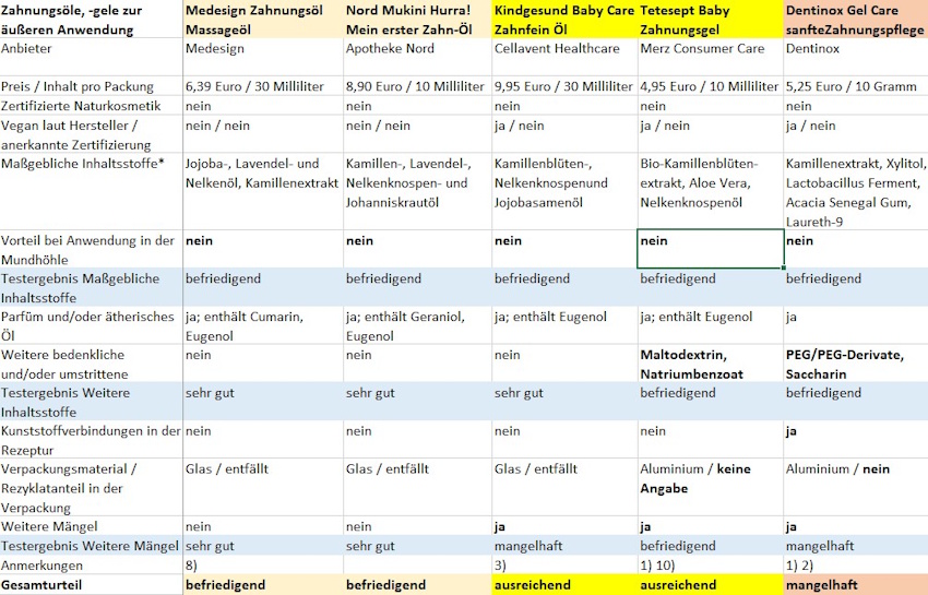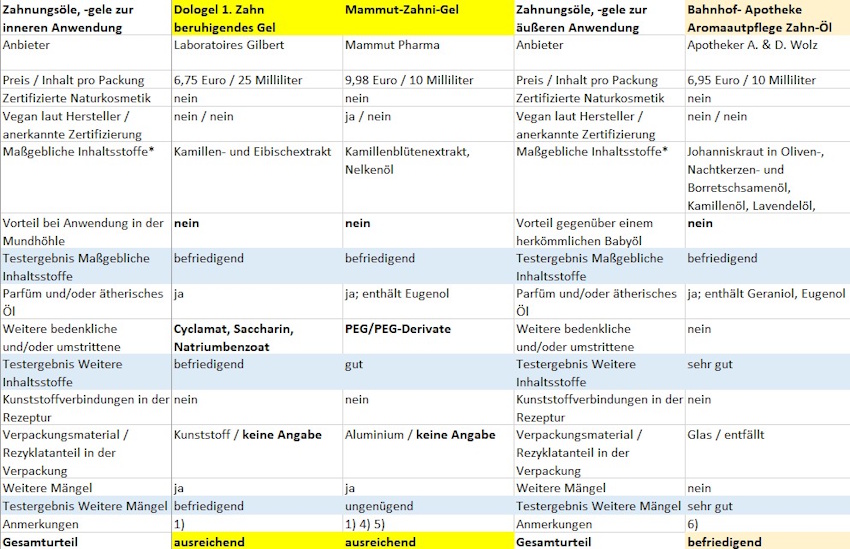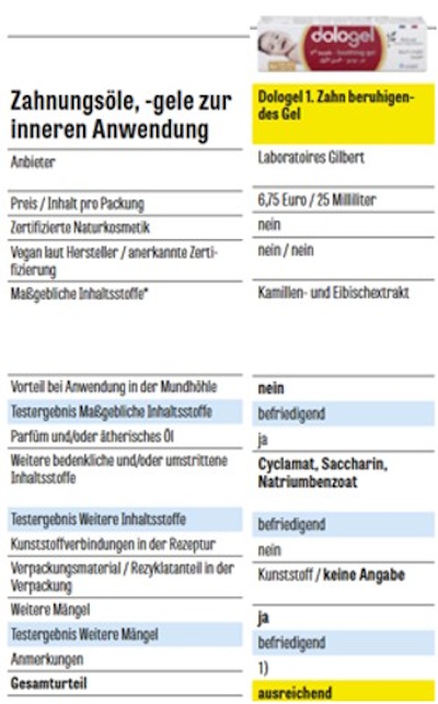 Zu den Mittel bei Zahnungsbeschwerden schreibt Öko-Test: „Bei der Einschätzung der Produkte hinsichtlich Nutzen, Wirksamkeit und Unbedenklichkeit unterstützte uns Prof. Manfred Schubert-Zsilavecz vom Institut für Pharmazeutische Chemie der Goethe Uni Frankfurt. Spezialisierte Labore untersuchten alle Zahnungsgele und -öle auf bedenkliche und deklarationspflichtige Duftstoffe. In alkoholhaltigen Produkten ließen wir den Alkoholgehalt messen. Per Deklaration erfassten wir PEG/PEG-Derivate, Propylenglykol, Maltodextrin und synthetische Polymere. Zudem erfassten wir bedenkliche Konservierungsstoffe wie Natriumbenzoat/Benzoesäure und Süßstoffe.“ Das Ergebnis: „Keines der Zahnungsgele oder -öle im Test schneidet mit sehr gut oder gut ab. Die beste Note ist befriedigend.“ Diesen und die anderen Tests haben wir Ihnen in den gleichnamigen Reitern dokumentiert.