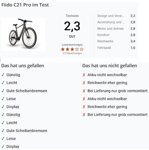 Auch die Testnote „gut (2,3)“ für das E-Bike Fiido C21 Pro ist falsch. Korrekt ist „gut (2,6)“. Für wenig Sorgfalt bei der Veröffentlichung spricht zudem, dass in den Rubriken „Das hat uns gefallen“ und „Das hat uns nicht gefallen“ alle Feststellungen doppelt aufgeführt sind.