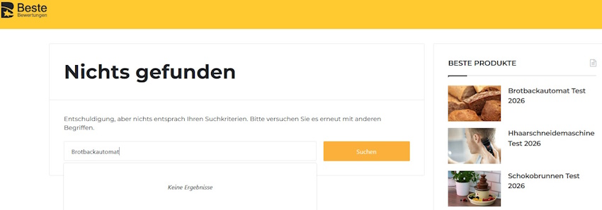 Bei so viel Dilettantismus wundert es nicht, dass die Suche auf der Seite nicht funktioniert. Gibt man zum Beispiel Brotbackautomat ein, heißt es: „Nichts gefunden“. Obwohl gleich daneben der „Brotbackautomat Test 2026“ aufgerufen werden kann. Das ist für User ärgerlich. Nicht für die, sondern für Beste Bewertungen dürfte sogar totärgerlich sein, dass die Seite Geld durch die Weiterleitung von Usern zu Amazon verdienen will, es aber nicht kann. Denn dafür braucht es Affiliate-Links. Wir aber keine gefunden und auch keine Hinweise auf andere Einnahmequellen.