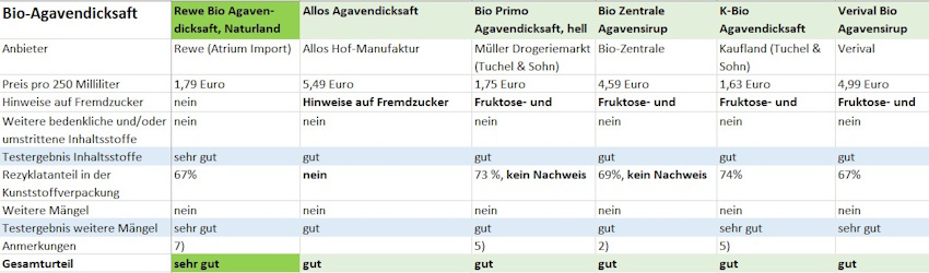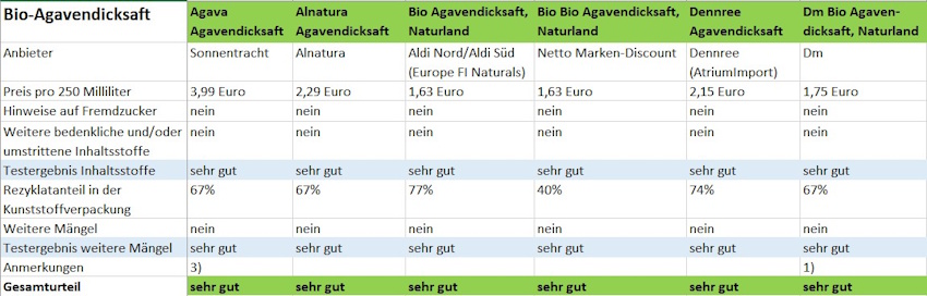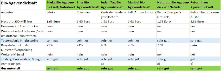 Anmerkungen: 1) Laut Anbieter wurde inzwischen die Grammatur des Artikels von 250 Milliliter auf 360 Milliliter erhöht. Die Restbestände würden noch abverkauft, während der neue Artikel bereits in den Märkten erhältlich sei. 2) Laut Hersteller findet in den nächsten drei Monaten eine Umstellung der Verpackung statt. Künftig werde das Produkt mit neuem Originalitätsverschluss ohne Siegeletikett verkauft. 3) Laut Hersteller wurde inzwischen das Layout angepasst, die Rezeptur bleibe unverändert. 4) Laut Hersteller ist die Firma „Lorenz & Lihn GmbH & Co. KG“ inzwischen vollständig in die „Reformkontor GmbH & Co. KG“ übergegangen, auf neueren Chargen sei „Reformkontor“ angegeben. 5) Laut Anbieter bzw. Hersteller ist das Produkt inzwischen in einer neuen Verpackung erhältlich. Das Produkt befände sich nun in einem neuen Squeezer mit neuem Deckel sowie angepassten Etiketten. Die Rezeptur, Zusammensetzung und Qualität blieben unverändert. 6) Laut Anbieter wurde zwischenzeitlich das Verpackungsdesign verändert und das Produkt sei derzeit in zwei Versionen im Handel verfügbar. 7) Laut Anbieter findet im März ein Lieferantenwechsel statt, das getestete Produkt des Lieferanten Atrium Import GmbH werde dann sukzessive abverkauft. 8) Laut Anbieter findet im Februar ein Lieferantenwechsel statt, das getestete Produkt des Lieferanten Europe Fi Naturals werde dann sukzessive abverkauft.