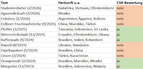 Das wirft die nächste Frage auf: Warum wurde kein Test zur Unternehmensverantwortung (Corporate Social Responsibility – CSR) durchgeführt. Denn schon im Februar 2024 hatte die damalige Chefredakteurin Kerstin Scheidecker zum Test Orangensaft geschrieben: „Wenn die Ernten mickrig sind, dann heißt das nichts Gutes für die Arbeitsbedingungen auf den Plantagen. Umso wichtiger, dass sich offenbar immer mehr Verbraucherinnen und Verbraucher für gute und faire Arbeitsbedingungen in den Herkunftsländern ihrer Lebensmittel interessieren.“ Nur fünf der 19 Hersteller bekamen ein „(sehr) gut“. Alle anderen wurden wegen der CSR-Ergebnisse abgewertet. Zum Beispiel der Orangen Direktsaft ohne Fruchtfleisch von Tegut. Seine Inhaltsstoffe waren „sehr gut“, das CSR-Ergebnis war „mangelhaft“ und das Gesamturteil deswegen nur „ausreichend“. Es ist unschwer vorherzusagen, dass ähnliches auch „(sehr) gutem“ Studentenfutter passieren würde.