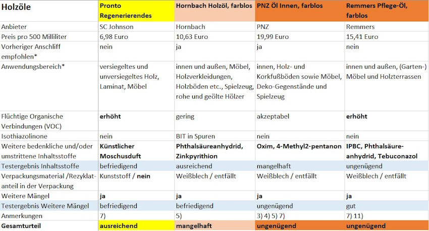 Anmerkungen: 1) Weiterer Mangel: Angabe der Inhaltsstoffe auf dem Gebinde entspricht nicht der VdL-Richtlinie. 2) Weiterer Mangel: Die Zusammensetzung im online abrufbaren Sicherheitsdatenblatt auf der Herstellerwebseite bzw. -onlineshop unterscheidet sich von der Version des Sicherheitsdatenblattes, die der Hersteller auf Anfrage zur Verfügung gestellt hat. 3) Weiterer Mangel: Umweltauslobung ohne ausreichende Information oder konkrete Fundstelle dazu auf dem Produkt (hier: PNZ Öl Innen, farblos: „CO2E neutral validiert durch SCBTI in scope 1-3“). 4) Weiterer Mangel: Nachweis von Oximen in einem als „oximfrei“ deklarierten Produkt (hier: 4-Methyl-2-pentanon-oxim). 5) Weiterer Mangel: Produkt ist als lösemittelfrei deklariert, weist jedoch einen gemessenen VOC-Gehalt von 700 mg/kg oder mehr auf. 6) Weiterer Mangel: Der gemessene VOC-Gehalt des Produkts liegt über dem deklarierten maximalen VOC-Gehalt auf der Verpackung und/oder im technischen Datenblatt. 7) Weiterer Mangel: Zwei bis vier der gemäß VdL-Richtlinie empfohlenen Gefahr- oder Sicherheitshinweise fehlen (hier: Adler Legno Pflegeöl: b), f); Auro Arbeitsplattenöl c), e), f), g); Bio Pin Möbelöl, Multi-Öl, Osmo Top Oil High Solid, PNZ Öl Innen, Ultra Nature Innen Arbeitsplattenöl f), g); Bondex Holzöl e), f), g); Clou Pflegeöl, Remmers Pflege-Öl a), b), f), g); Ikea Trixig Holzöl e), f); Renuwell Möbel-Öl b), f), g); Swingcolor Arbeitsplattenöl a), f), g); Poliboy Möbel Öl, Pronto Möbel-Öl b), c), f), g)). 8) Weiterer Mangel: PVC/PVDC/chlorierte Verbindungen in der Siegelfolie. 9) Weiterer Mangel: Produkt ist als geruchsarm oder geruchsneutral deklariert, der Hersteller konnte uns auf Anfrage jedoch keine ausreichenden produktbezogenen Nachweise liefern (hier: Clou Pflegeöl, Obi Holz-Öl, Toom Arbeitsplatten-Öl, Vincent Arbeitsplatten-Öl: „geruchsarm“; Poliboy Möbel-Öl: „geruchsneutral“). 10) IPBC auf dem Gebinde deklariert, aber im Labor nicht nachgewiesen. 11) 2-Ethylhexansäure im Sicherheitsdatenblatt deklariert, aber im Labor nicht nachgewiesen. Laut Anbieter wird 2-Ethylhexansäure seit Sommer 2025 nicht mehr in dem Produkt eingesetzt. 12) Laut Anbieter wird die Siegelfolie standardmäßig nicht verwendet, sondern nur angebracht, wenn das Produkt aus dem Onlineshop verschickt wird, um Transportschäden vorzubeugen.