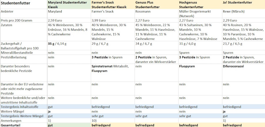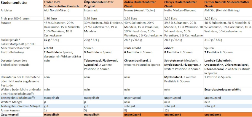 Unsere Einschätzung: Im Test Studentenfutter fanden wir die ersten Fehler, aber nicht die letzten. Für drei Produkte ergeben die von Öko-Test aufgeführten Inhaltsstoffe nicht 100 Prozent.