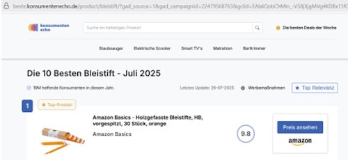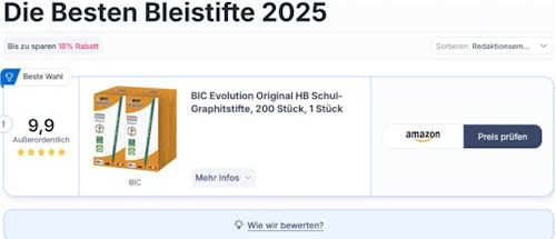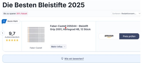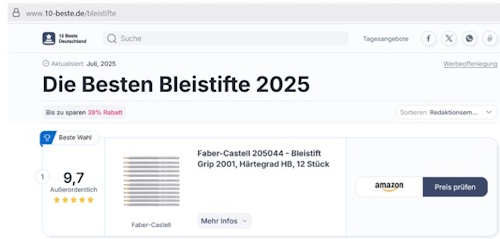 „Wir empfehlen diese Produkte auf der Grundlage eines intensiven Forschungsprozesses, der darauf ausgelegt ist, das Rauschen wegzufiltern und die besten Produkte in diesem Bereich zu finden. Unter der Leitung von Experten verbringen wir Stunden damit, die wichtigsten Faktoren zu untersuchen, um Ihnen diese Auswahl zu bieten“, schreibt 10bestdeals.de unter der Überschrift „Wie wir getestet haben“. „Unsere leistungsstarke KI durchsucht das Internet, um Kaufratgeber von Experten und Nutzerbewertungen zu finden, und filtert diese durch einen anspruchsvollen Algorithmus sowie manuelle Bewertungen, um Dir die relevantesten und hilfreichsten Informationen für Dein gewünschtes Produkt zu präsentieren“, heißt es weiter. Die „leistungsstarke KI“ weist im Beitrag „Die Besten Bleistifte 2025“ am 27.7.2025 um 8 Uhr 38 die Faber-Castell 205044 als „Beste Wahl“ mit der Note „Außerordentlich (9,7)“ auf Platz 1 aus. Auf dem zweiten Platz landen die Amazon Basic holzgefasste Bleistifte als „Bester Wert“ mit der Note „Außerordentlich (9,6)“.