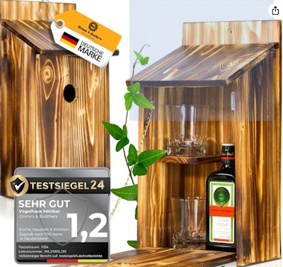 Das gleiche gilt für den „Testbericht“ des Grimm & Brothers: Vogelhaus Minibar. Es erhält von testsiegel24.de für den ersten Eindruck 90 von 100 Punkten. Begründung: keine, ebenso wenig wie für die 100 Punkte für die Qualität, die 20 von 30 möglichen Punkten für sonstiges und die 10 von 30 Punkten für die produktspezifische Bewertung. Wahrscheinlich reicht die Zeit nicht aus, um sich irgendetwas geistreiches auszudenken. Denn "Innerhalb von 7 Tagen erhältst du dein Testsiegel."