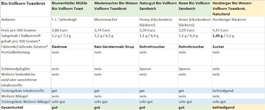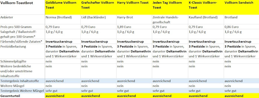 Zumindest für einige Regionen stimmt das Gesamturteil für den Gut & Günstig Vollkorn Toast von Edeka nicht. Er enthält laut Öko-Test keine süßende Zutat. In der Zutatenliste auf edeka.de ist jedoch Invertzuckersirup aufgeführt. Auf Nachfrage schreibt uns Edeka: „Unsere Eigenmarkenartikel werden teilweise je nach Region von unterschiedlichen Herstellern zugeliefert. Die Rezepturen können sich dabei je nach Hersteller leicht voneinander unterscheiden. Dies betrifft in diesem Fall auch das Gut & Günstig Vollkorntoast.“ Mit dem Sirup ist das Gesamturteil nicht „sehr gut“, sondern „gut“. Daher: Wenn man sich schon auf die Deklaration verlässt und nicht testet, sollte man sicherstellen, dass sie korrekt ist. Zumindest ein Doppelcheck von Produkt und Internetseite sollte selbstverständlich sein.