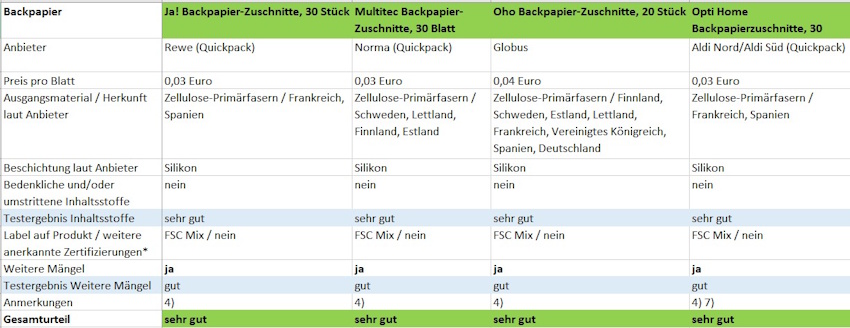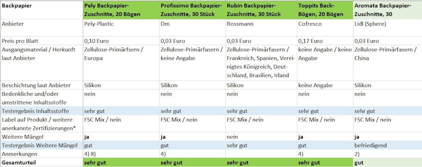 * Anerkannte Zertifizierungen: Von Herstellern angegebene FSC-Mix-, FSC-100 %- oder PEFC-Zertifizierungen zur Herkunft des Holzes für die Zellulose im Backpapier haben wir nur anerkannt, wenn sie auf dem Produkt gelabelt sind oder durch entsprechend gekennzeichnete Lieferbelege dem getesteten Produkt zuzuordnen waren.