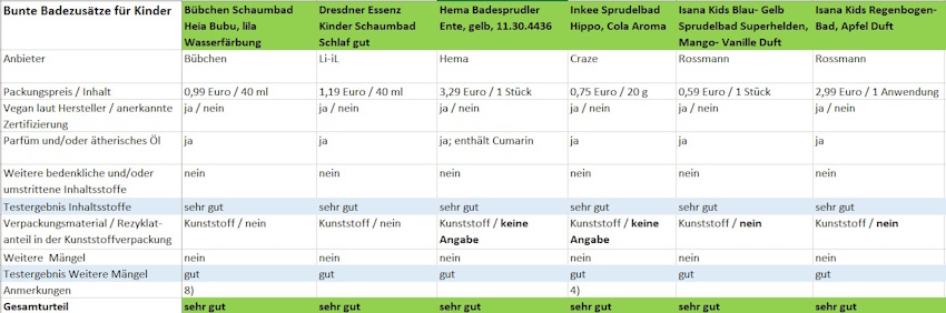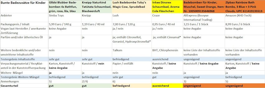 Anmerkungen: 1) Weiterer Mangel: Umkarton, der kein Glas schützt und/oder nicht mehrere Komponenten enthält. 2) Weiterer Mangel: Umweltauslobung ohne ausreichende Information oder konkrete Fundstelle auf dem Produkt (hier: „Wir leben Nachhaltigkeit.“). 3) Weiterer Mangel: keine Angabe des Herstellers bzw. des EU-Verantwortlichen auf dem Produkt bzw. der Verpackung 4) Duftstoff Cinnamal deklariert, aber im Labor nicht nachgewiesen. Gehalte von Duftstoffen können unter anderem je nach Alter und Zusammensetzung des Produkts schwanken. Cinnamal-Allergiker sollten das Produkt vorsichtshalber nicht verwenden. 5) Weiterer Mangel: zusätzliche Folie um Umkarton, obwohl die Badebomben schon jeweils einzeln in einer Folie und im Umkarton verpackt sind. 6) Laut Anbieter wird in den kommenden Monaten eine neue Variante des Produkts in Produktion gehen, bei der die talkumhaltigen Bestandteile durch talkumfreie Alternativen ersetzt werden. 7) Laut Anbieter wird das Produkt durch das „Tinti Schaumbad blau“ mit Feuerwehrmotiv ersetzt, dabei werde die Rezeptur hinsichtlich der Farbe geändert. 8) Laut Anbieter ist das Produkt ausgelistet. 9) Laut Anbieter ist das Produkt mittlerweile in einem neuen Packaging (Polizeiauto) im Handel, die Rezeptur sei unverändert. Zudem sei u.a. die Umweltauslobung „Wir leben Nachhaltigkeit.“ von der Verpackung entfernt worden. 10) Laut Produktbeschreibung auf dem Temu-Marktplatz für Kinder ab 12 Jahren empfohlen. 11) Laut Anbieter enthält das Produkt 70 g Inhalt, bei der angegebenen Füllmenge handele es sich um einen Druckfehler.