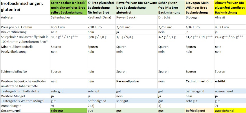 Anmerkungen: 1) Weiterer Mangel: fehlende Angabe zum Ballaststoffgehalt auf der Verpackung. 2) Weiterer Mangel: zusätzliche Umverpackung aus Pappe, obwohl das Produkt schon in einem Beutel verpackt ist. 3) Weiterer Mangel: fehlender Hinweis, dass Mehle und Teige nicht zum Rohverzehr bestimmt sind. 4) Laut Anbieter wurde das Produkt bei Aldi Süd bereits Ende Oktober ausgelistet, Restbestände werden abverkauft. 5) Laut Herstellergutachten zu chargengleichem Produkt wurden geringere MOSH-Gehalte nachgewiesen 6) Laut Anbieter wird das Produkt nicht mehr hergestellt, Restbestände werden abverkauft. 7) Weiterer Mangel: zu starke Abweichung des deklarierten Salzgehalts vom im Labor ermittelten Wert nach unten. 8) Laut Anbietergutachten zu chargengleichem Produkt wurden geringere Pestizidrückstände sowie keine Schimmelpilzbefunde im Spurenbereich nachgewiesen. 9) Weiterer Mangel: zu starke Abweichung des deklarierten Salzgehalts vom im Labor ermittelten Wert nach oben. 10) 500 g Brotbackmischung ergeben laut Hersteller 1000 bis 1050 Gramm zubereitetes Brot. Auch bei Zugrundelegung dieser Herstellerangabe für die Berechnungen bleibt das Testergebnis Inhaltsstoffe gleich.