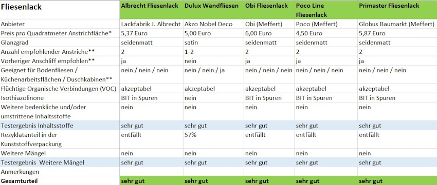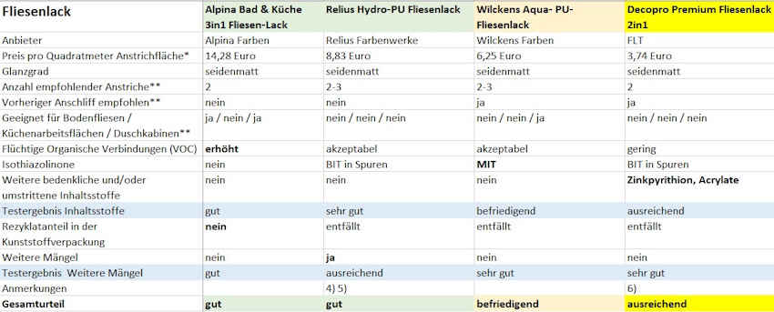 Anmerkungen: 1) Weiterer Mangel: Der gemessene VOC-Gehalt des Produkts liegt über dem deklarierten maximalen VOC-Gehalt auf der Verpackung. 2) Weiterer Mangel: Produkt ist als lösemittelfrei deklariert, weist jedoch einen gemessenen VOC-Gehalt von 700 mg/kg oder mehr auf. 3) Weiterer Mangel: Zwei bis vier der Gefahr- oder Sicherheitshinweise fehlen (hier: Hornbach 2in1 Fliesenlack c), f) g); Molto Fliesen Lack c), g), h); Fliesenlack c), e), g), h); Schöner Wohnen Pep Up b), c), f), g)). 4) Weiterer Mangel: Fünf oder mehr der Gefahr- oder Sicherheitshinweise fehlen (hier: Relius Hydro-PU Fliesenlack a), b), c), d), e), g), h); Decotric Aqua-Fliesenlack 3 in 1 b), c), e), g), h)). 5) Weiterer Mangel: Angabe der Inhaltsstoffe auf dem Gebinde entspricht nicht der VdL Richtlinie. 6) Der Hersteller hat angekündigt, das enthaltene Zinkpyrithion durch das weniger bedenkliche Natriumpyrithion zu ersetzen. Die veränderte Formulierung sei anhand der angepassten Deklaration erkennbar. 7) Laut Hersteller ist eine separate Grundierung erforderlich.