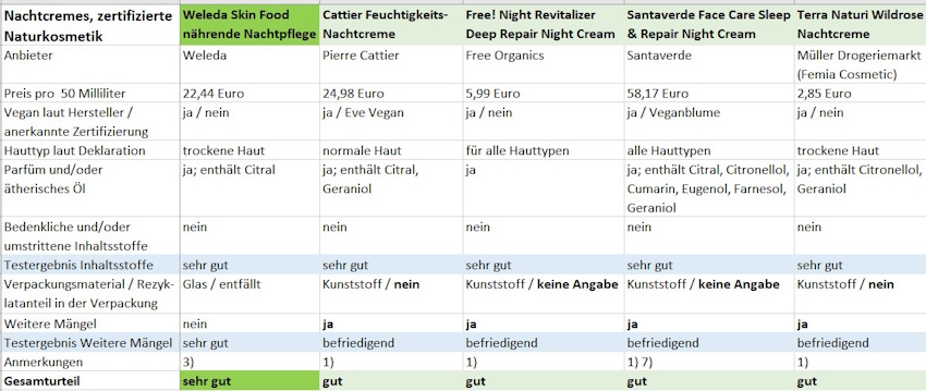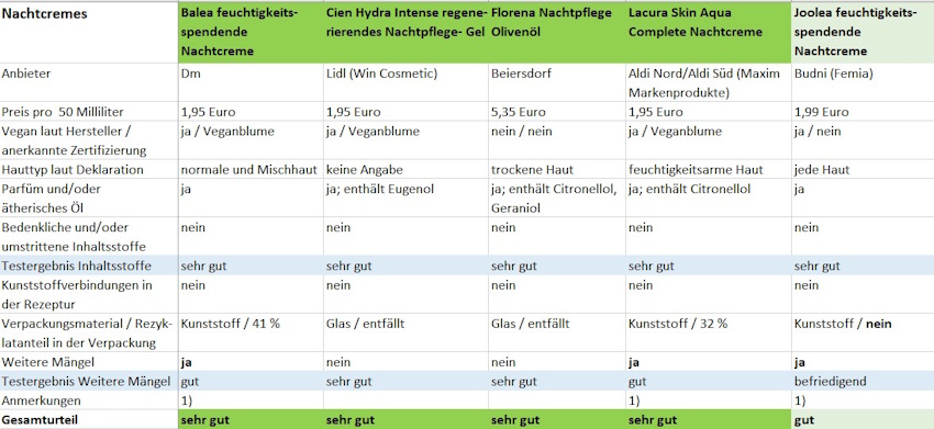 Anmerkungen: 1) Weiterer Mangel: Umkarton, der kein Glas schützt. 2) Weiterer Mangel: Silikone und/oder synthetische Polymere als weitere Kunststoffverbindungen (hier: Garnier: „Acrylates/C10 30 Alkyl Acrylate Crosspolymer“; L‘ Oréal: „Dimethicone, Hydrogenated Polyisobutene, Acrylamide/ Sodium Acryloyldimethyltaurate Copolymer“; Neutrogena „Dimethicone, Polyacrylate Crosspolymer-6“; Judith Williams: „Sodium Polyacrylate“). 3) Geraniol deklariert, aber im Labor nicht nachgewiesen. Gehalte an Duftstoffen können unter anderem je nach Alter des Produkts schwanken. Geraniol-Allergiker sollten das Produkt vorsichtshalber nicht verwenden. 4) Laut Anbieter wird das Produkt zukünftig im Tiegel anstelle eines Pumpspenders angeboten. 5) Laut Anbieter wird das Produkt voraussichtlich ab Ende des Jahres ohne Faltschachtel als Umkarton angeboten. 6) Laut Anbieter wurde die Faltschachtel des Produktes angepasst und unter anderem die Auslobung „Aufpolsterung-Glättung“ entfernt und durch „Feuchtigkeit“ ersetzt. 7) Laut Anbieter wurde die Deklaration Ende Oktober 2025 angepasst und Glyceryl Caprylate ergänzt.