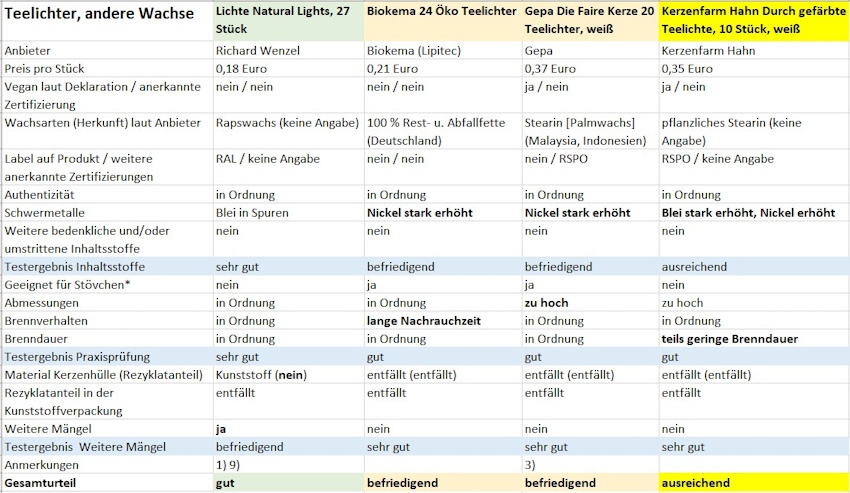 Anmerkungen: 1) Weiterer Mangel: Umweltauslobung ohne ausreichende Information oder konkrete Fundstelle dazu auf dem Produkt (hier: Steinzeiteffekt: „CO₂ + Baumpositiv, JA zur Wiederaufforstung“; Bolsius: „Certified B Cooperation, Bolsius meets high standards of social and environmental impact“; Lichte Natural: „Eco sensitive and earth friendly. CO₂ neutraler Abbrand“). 2) Weiterer Mangel: RAL Gütezeichen auf dem Produkt abgebildet, wobei das Produkt die Vorgaben nach RAL für ein Teelicht nicht einhält. 3) Laut Anbieter ist das Produkt seit Ende 2024 in leicht verändertem Verpackungsdesign im Handel verfügbar. Die Rezeptur sei unverändert. 4) Laut Hersteller lässt sich eine geringere Brenndauer durch die natürliche Alterung von Paraffin erklären. Seit Oktober werde das Produkt mit veränderter Rezeptur an die Norma Filialen ausgeliefert. Die neue Version bestehe aus 69 % Paraffin und 31 % RSPO-zertifiziertem Palmöl. 5) Laut Anbieter ist aktuell nur noch die 100 Stück Variante im Sortiment, diese unterscheide sich aber nur in Menge und Preis vom getesteten Produkt. 6) Laut Anbieter wird im 1. Quartal 2026 auf eine 80 %ige PCR-Schrumpffolie umgestellt. 7) Laut Anbieter handelt es sich bei dem getesteten Produkt um den Nachfüllpack eines anderen Produkts (Artikelnummer 101330700), das 10 Teelichter und ein Glas enthält. 8) In der Verpackung ist ein Kerzenhalter aus Glas enthalten, der wiederverwendet wird. Der Hersteller ist laut eigenen Angaben bemüht darum, einen neuen Lieferanten zu finden, der hochwertiges Bienenwachs aus der EU anbietet. Ferner wolle er die Authentizitätsprüfung selbst mehr in den Fokus rücken und zukünftig auch eine Chargennummer auf dem Produkt aufbringen. 9) Laut Anbieter bestehen die Kerzenhüllen aus 100 % Post-Industrial-Material (PIR). Auf der Verpackung ist „Cups aus 100 % recyceltem Material“ ausgelobt. Für unsere Bewertung erkennen wir jedoch nur PCR an. 10) Laut Anbieter wurden auf Basis interner Kontrollen an der Brenndauer Mitte 2025 in der Produktion Optimierungsmaßnahmen vorgenommen. Die hier geprüften Teelichter stammten aus dem Jahr 2024 ohne die entsprechenden Optimierungsmaßnahmen. 11) Laut Anbieter ist das Produkt im Herbst ausgelaufen und es würden nur noch Restmengen dieses Lieferanten abverkauft werden.