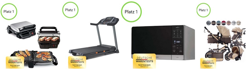 Unsere Einschätzung, dass hier nichts getestet wird, bestätigen die Testsieger in anderen „Tests“. Alle wie der Kontaktgrill, das Laufband, die Mikrowelle und der Kinderwagen sind „sehr gut (1,2)“ und „Häufig vergriffen“. Ironischer Weise ist der Mikrowellen-Testsieger bei Amazon in größerer Stückzahl im Angebot. Zwei andere der angeblich besten fünf sind dagegen „Derzeit nicht verfügbar“.