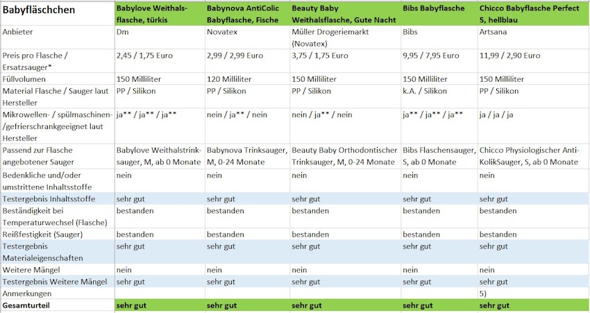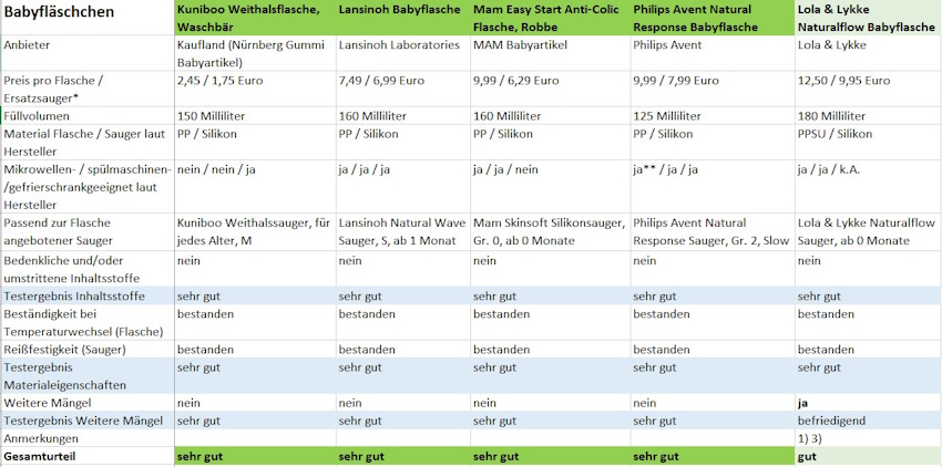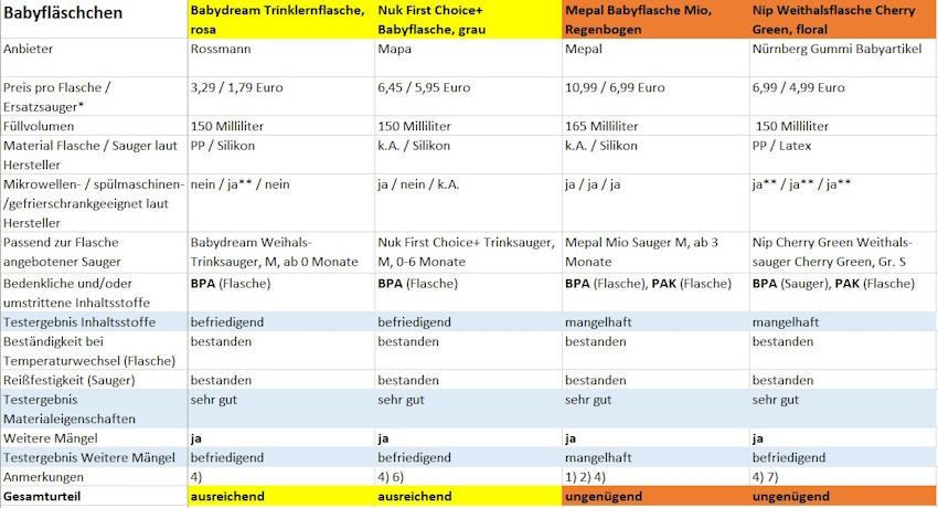 Anmerkungen: 1) Weiterer Mangel: fehlender Sicherheitshinweis nach DIN 14350 (hier: „Bringen Sie niemals Schnüre, Bänder, Schnürsenkel oder Teile von Kleidungsstücken an das Produkt an. Strangulationsgefahr!“). 2) Weiterer Mangel: fehlender Sicherheitshinweis nach DIN 14350 (hier: „Vor jedem Gebrauch den Ernährungssauger überprüfen und in alle Richtungen ziehen. Bei ersten Anzeichen von Schäden oder Schwachstellen wegwerfen.“). 3) Weiterer Mangel: PVC/PVDC/chlorierte Verbindungen in der Verpackung. 4) Weiterer Mangel: eine Auslobung, die suggeriert, dass das Produkt frei von BPA ist, auf einem Produkt, bei welchem BPA nachgewiesen wurde. 5) Laut Hersteller wird das Produkt zukünftig in einem veränderten Verpackungsdesign erhältlich sein. 6)