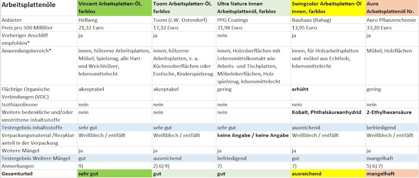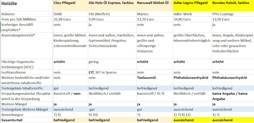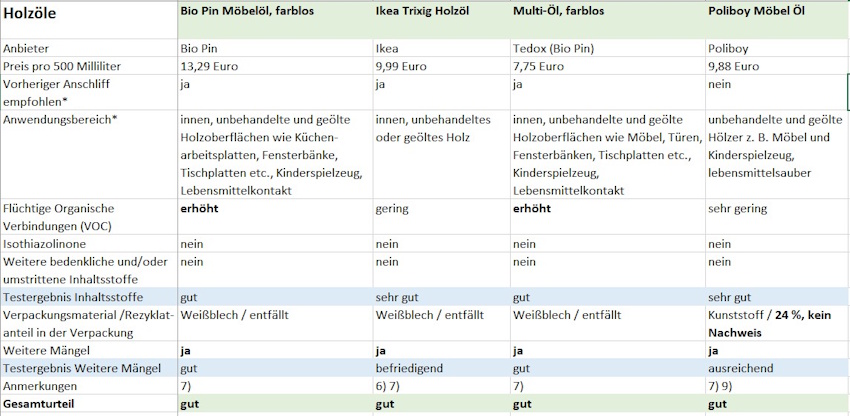 Anmerkungen: 1) Weiterer Mangel: Angabe der Inhaltsstoffe auf dem Gebinde entspricht nicht der VdL-Richtlinie. 2) Weiterer Mangel: Die Zusammensetzung im online abrufbaren Sicherheitsdatenblatt auf der Herstellerwebseite bzw. -onlineshop unterscheidet sich von der Version des Sicherheitsdatenblattes, die der Hersteller auf Anfrage zur Verfügung gestellt hat. 3) Weiterer Mangel: Umweltauslobung ohne ausreichende Information oder konkrete Fundstelle dazu auf dem Produkt (hier: PNZ Öl Innen, farblos: „CO2E neutral validiert durch SCBTI in scope 1-3“). 4) Weiterer Mangel: Nachweis von Oximen in einem als „oximfrei“ deklarierten Produkt (hier: 4-Methyl-2-pentanon-oxim). 5) Weiterer Mangel: Produkt ist als lösemittelfrei deklariert, weist jedoch einen gemessenen VOC-Gehalt von 700 mg/kg oder mehr auf. 6) Weiterer Mangel: Der gemessene VOC-Gehalt des Produkts liegt über dem deklarierten maximalen VOC-Gehalt auf der Verpackung und/oder im technischen Datenblatt. 7) Weiterer Mangel: Zwei bis vier der gemäß VdL-Richtlinie empfohlenen Gefahr- oder Sicherheitshinweise fehlen (hier: Adler Legno Pflegeöl: b), f); Auro Arbeitsplattenöl c), e), f), g); Bio Pin Möbelöl, Multi-Öl, Osmo Top Oil High Solid, PNZ Öl Innen, Ultra Nature Innen Arbeitsplattenöl f), g); Bondex Holzöl e), f), g); Clou Pflegeöl, Remmers Pflege-Öl a), b), f), g); Ikea Trixig Holzöl e), f); Renuwell Möbel-Öl b), f), g); Swingcolor Arbeitsplattenöl a), f), g); Poliboy Möbel Öl, Pronto Möbel-Öl b), c), f), g)). 8) Weiterer Mangel: PVC/PVDC/chlorierte Verbindungen in der Siegelfolie. 9) Weiterer Mangel: Produkt ist als geruchsarm oder geruchsneutral deklariert, der Hersteller konnte uns auf Anfrage jedoch keine ausreichenden produktbezogenen Nachweise liefern (hier: Clou Pflegeöl, Obi Holz-Öl, Toom Arbeitsplatten-Öl, Vincent Arbeitsplatten-Öl: „geruchsarm“; Poliboy Möbel-Öl: „geruchsneutral“). 10) IPBC auf dem Gebinde deklariert, aber im Labor nicht nachgewiesen. 11) 2-Ethylhexansäure im Sicherheitsdatenblatt deklariert, aber im Labor nicht nachgewiesen. Laut Anbieter wird 2-Ethylhexansäure seit Sommer 2025 nicht mehr in dem Produkt eingesetzt. 12) Laut Anbieter wird die Siegelfolie standardmäßig nicht verwendet, sondern nur angebracht, wenn das Produkt aus dem Onlineshop verschickt wird, um Transportschäden vorzubeugen.