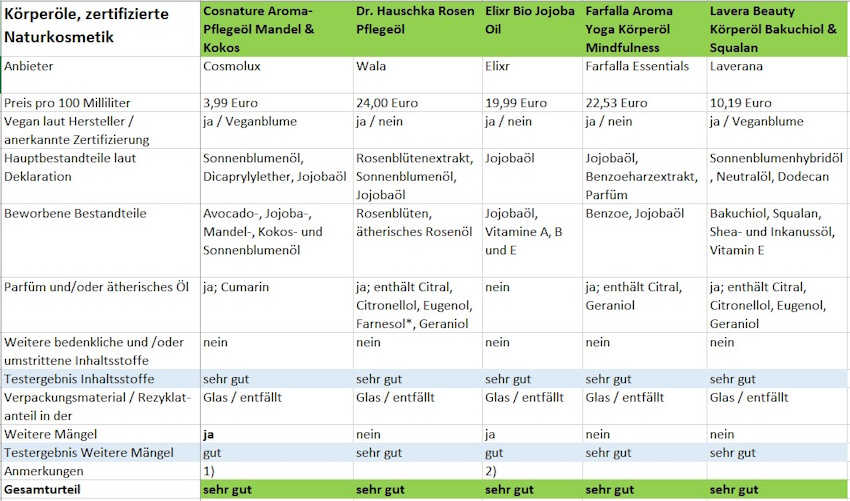 Viele Fragen wirft auch der Test Körperöle auf. Und auch er enthält Fehler. Wir haben ihn und die anderen Tests in den gleichnamigen Reitern dokumentiert und kommentiert.