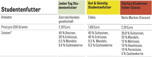 Für das Jeden Tag Studentenfutter kommen wir auf 96,9 Prozent (der Internetseite der Zentralen Handelsgesellschaft zufolge sind sogar nur 9,0, nicht 9,4 Prozent Cashewkerne enthalten und wir kämen damit nur auf insgesamt 96,2 Prozent). Das Gut & Günstig Studentenfutter kommt auf 99,0 und das Clarkys Studentenfutter Classic 99,8 Prozent. Die Fehler haben zwar keinen Einfluss auf die Bewertung der Produkte. Aber es bleiben Fehler und sie werfen die Frage auf: Wo verbergen sich weitere, nicht so offensichtliche?