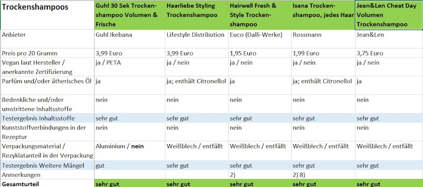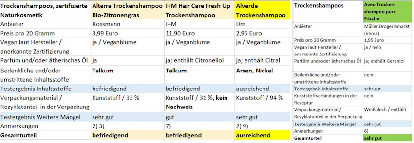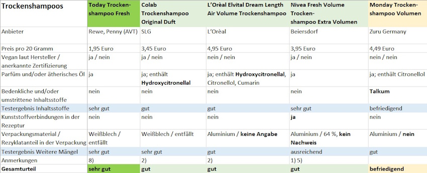 Wie bei den Körperölen hat man auch in diesen Test bei etlichen Produkten Duftstoffe übersehen. Beispielsweise beim Aveo Trockenshampoo pure Frische Linalyl Acetate, Terpineol, Camphor, Carvone, Limonene und Linalool und beim Colab Trockenshampoo Original Duft Limonene und Hexyl Cinnamal.