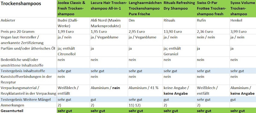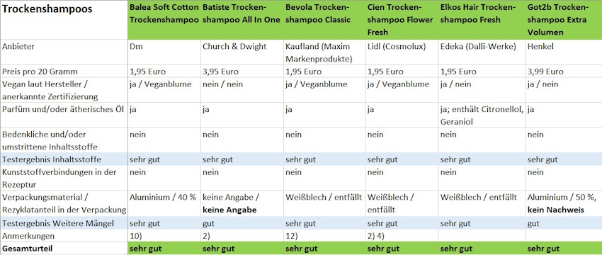 Anmerkungen: 1) Weiterer Mangel: synthetische Polymere (hier: „Polyquaternium-11“). 2) Duftstoff deklariert, aber im Labor nicht nachgewiesen. Gehalte an Duftstoffen können unter anderem je nach Alter des Produkts schwanken. Allergiker sollten das Produkt vorsichtshalber nicht verwenden (hier: Batiste, Cien, Rituals: „Citronellol“; Alverde, Isana, L´Oreàl, Joolea, Swiss O-Par: „Geraniol“; Hairwell, Colab, Lacura: „Citronellol und Geraniol“; Alterra: „Citral und Geraniol“). 3) Laut Anbieter gibt es eine Änderung der Rezeptur. Die neue Variante ohne Talkum werde voraussichtlich ab Februar/März 2026 erhältlich sein. 4) Laut Anbieter hat sich die Verpackung des Produktes geändert und wird ab Januar 2026 im Handel verfügbar sein. Die Rezeptur, EAN sowie Design und Auslobungen blieben unverändert. 5) Laut Anbieter wird es ab März 2026 einen Relaunch hinsichtlich der Ausformulierung von Heliotropin sowie nicht biologisch abbaubaren Polymeren geben. 6) Laut Anbieter wird das Layout umgestellt. Es werde einen neuen EAN Code mit GTIN: 4053776010069 geben, die Rezeptur bleibe unverändert. 7) Laut Anbieter wird das Trockenshampoo abverkauft und nicht mehr produziert. Mittelfristig werde das Produkt das Sortiment verlassen. 8) Das Produkt trägt keine Vegan-Auslobung. Der Anbieter teilte uns auf Anfrage mit, dass es vegan sei. 9) Laut Anbieter wird das Layout des Produkts angepasst. Verfügbar sei es voraussichtlich ab KW19 in 2026 mit der GTIN 4066447919240. 10) Laut Anbieter werden Rezeptur und Auslobungen leicht verändert. Das angepasste Produkt sei voraussichtlich ab Mai 2026 mit der GTIN 4066447989328 verfügbar. 11) Laut Anbieter wird das Druckbild verändert, die Rezeptur bleibe gleich. Das angepasste Produkt sei voraussichtlich ab Frühjahr/Sommer 2026 mit der GTIN 4066447973594 erhältlich. 12) Auf der Verpackung ist zwar kein Veganblume-Label abgedruckt, der Anbieter hat uns aber ein entsprechendes Zertifikat vorgelegt.
